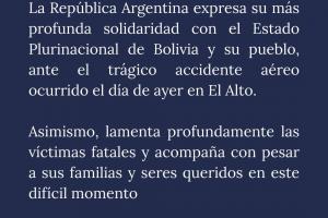 La República Argentina expresa su más profunda solidaridad con el Estado Plurinacional de Bolivia y su pueblo, ante el trágico accidente aéreo ocurrido el 27 de febrero en El Alto.