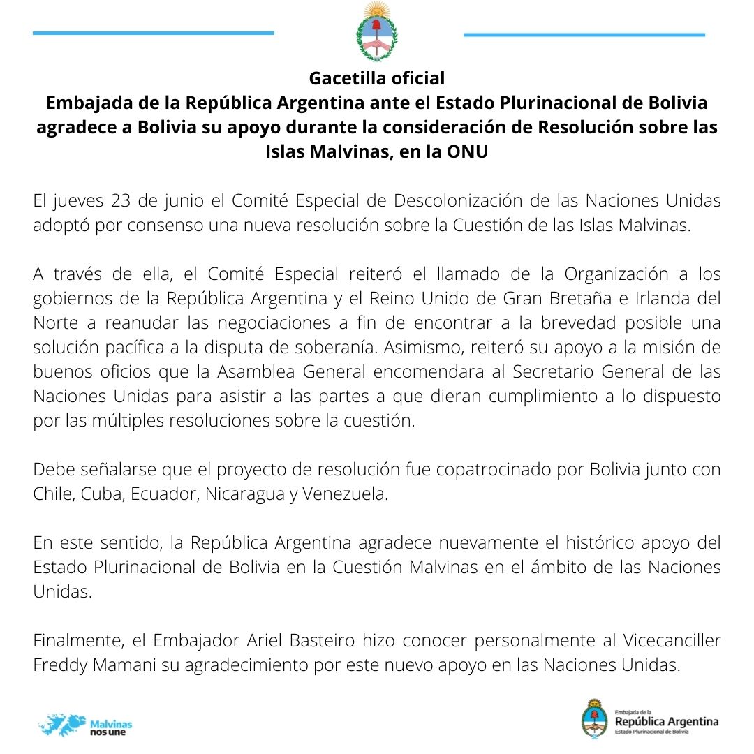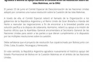 En este sentido, la República Argentina agradece nuevamente el histórico apoyo del Estado Plurinacional de Bolivia en la Cuestión Malvinas en el ámbito de las Naciones Unidas.