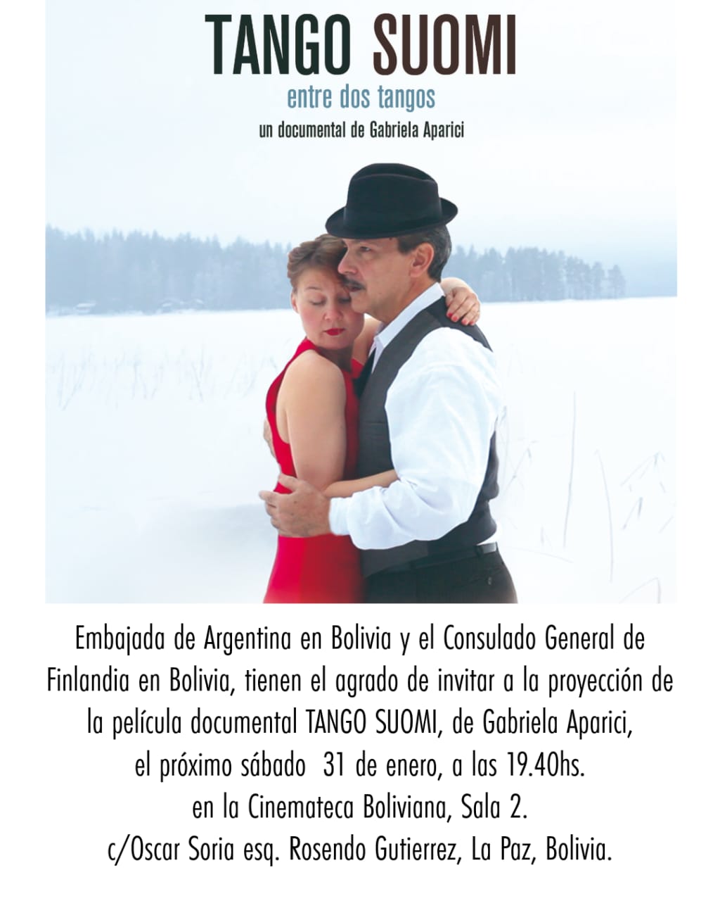 Tras un exitoso recorrido por festivales de Europa y Latinoamérica, el documental "Tango Suomi" se presentará en La Paz el día 31 de enero a las 19.40hs en la Cinemateca Boliviana (Rosendo...